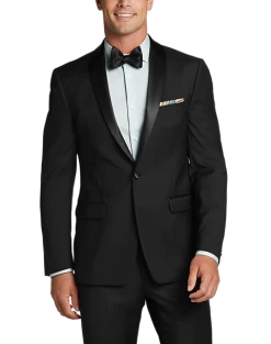 This stylish tuxedo jacket is a modern standout from Calvin Klein. Tailored in fine 100% natural stretch wool, this jacket has a smooth satin shawl collar, satin-covered buttons and satin trim at the pockets.