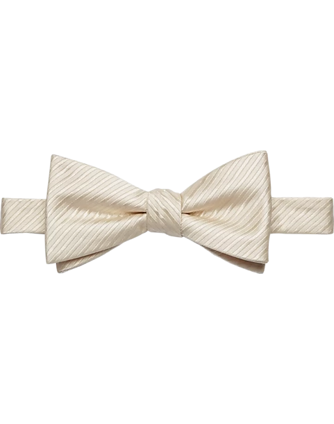 This stylish, easy-to-wear pre-tied bow tie features a classic stripe pattern that has a woven texture and a luminous tan hue.
