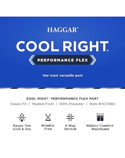 - 100% Polyester|Cool Right®|technology wicks moisture and keeps you dry|4-way stretch|Pleated Front|Pre-hemmed|Classic Fit|Haggar|