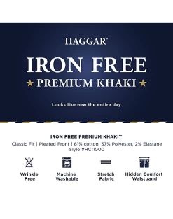 - 59% cotton 39% polyester 2% elastane|Non-iron|Stretch fabric|Hidden expandable waistband|Pleated front|Classic Fit|Haggar|