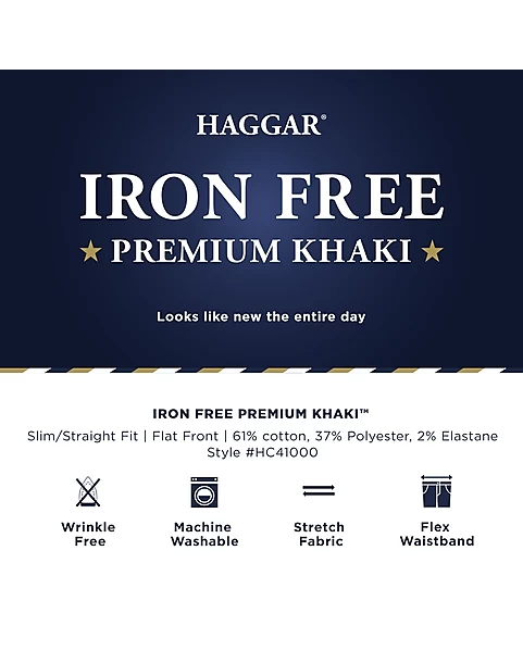- 61% cotton 37% polyester 2% elastane|Non-iron|Wrinkle-free|Comfort-stretch fabric|Shirt gripper for a neat look|Flat front|Straight leg|Classic Fit|Haggar Premium|