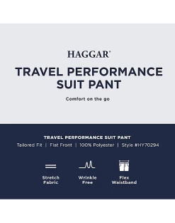 - 100% polyester|Built-in stretch for comfort|Flat front|Classic Fit|Coordinating pieces sold separately|Haggar Travel Performance|