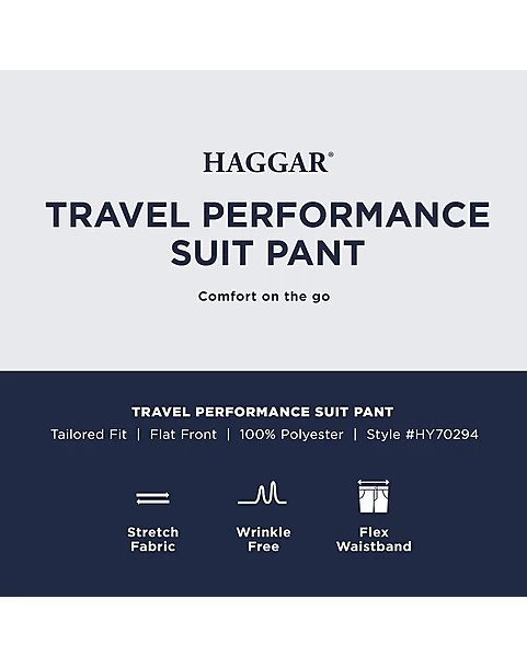 Designed for the busy jet-setter who needs to move with ease, these Haggar Travel Performance suit separates pants are moisture wicking with wrinkle-free fabric and ample stretch. They feature a hidden, flex waistband and smooth, flat front for a contemporary look and comfortable feel. Suit separates let you select coat, pant, and vest sizes independently for an ideal fit.