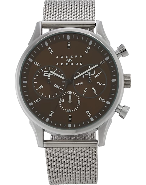 A brushed silver-tone bracelet and case fashion this contemporary watch from Joseph Abboud. Featuring three subdials displaying the day, date, and 24-hour time over a chocolate brown face, this timepiece will complete your up-to-date look.