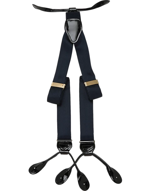 A practical personality statement these fancy navy silk braces are a comfortable alternative to a belt and will keep your look straight and smooth all day.