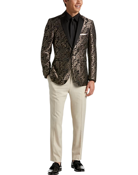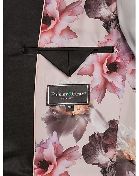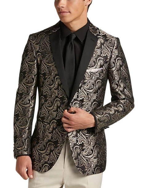 Make a bold, regal statement with this finely crafted dinner jacket by Paisley & Gray. Pairing richly woven jacquard embroidery with a black satin peak lapel, it is tailored with a trim, Slim Fit to offer a sleek look of adornment for your next special occasion.