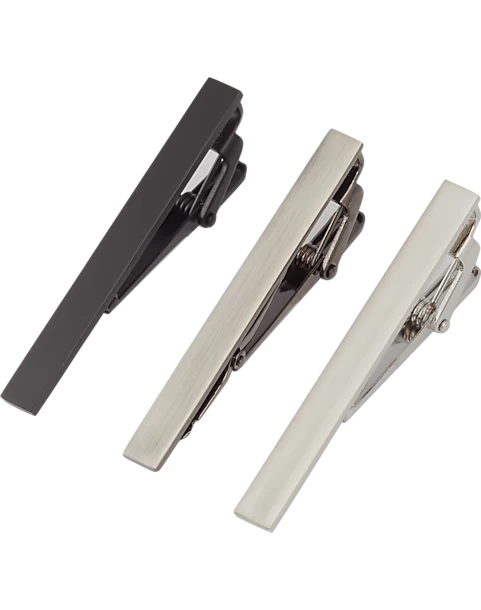 This three pack of stylish tie bars features a black finish, mid-gray finish, and bright silver-toned finish tie bars set.