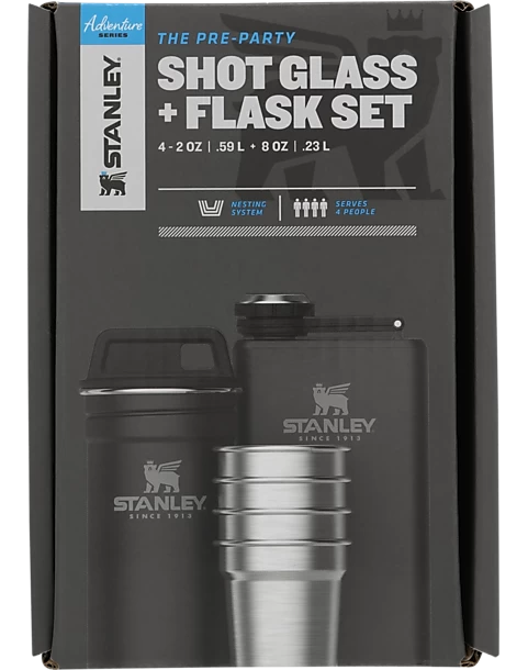 Celebrate almost anywhere with this shot glass and flask set. The stainless steel shot glasses nest neatly inside the carrying case and won t break, even if you drop them. The slim 8 oz. flask holds enough to fill all four shots, and still slides easily into the included carrying case.